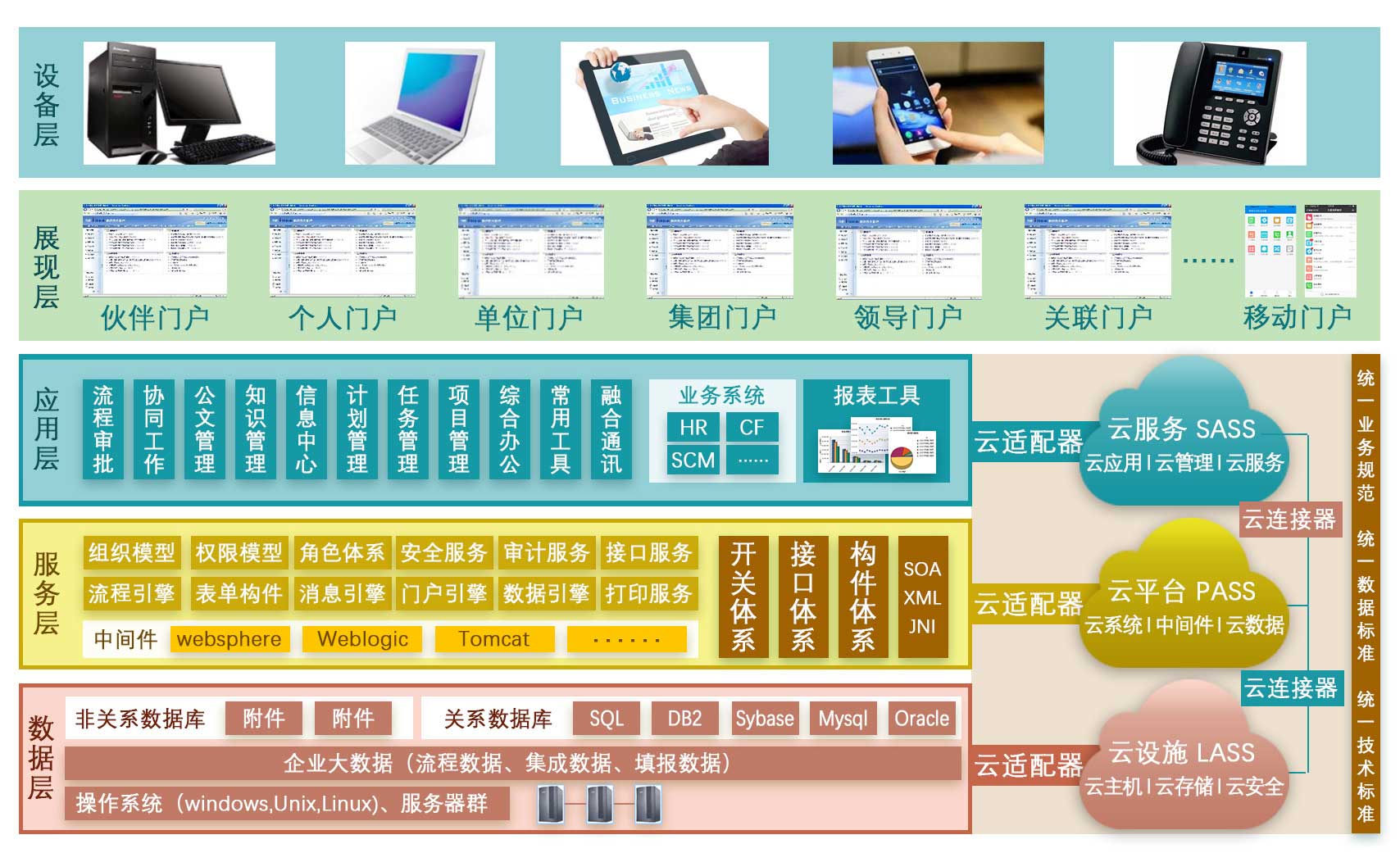 平臺基于開發JAVA語言開發,以四層(數據層、服務層、應用層、展現層)技術架構,遵循J2EE標準、 SOA標準、WFMC標準、W3C xForm標準、JSR168、WSRP等標準,封裝了大量接口、構件,以多維門戶 形式展現,系統支持各種部署模式、各種操作系統、各種數據庫和中間件,并具備完備的配置體系、接口體系和插 件體系,支持未來的不斷擴展。