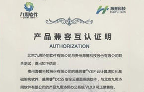 北京九思協同軟件有限公司研發的九思協同辦公系統V10.0與貴州海譽科技股份有限公司研發的盛思睿?VSIP云計算虛擬化基礎構建軟件、盛思睿?DCSS安全云桌面系統軟件順利完成產品兼容互認。