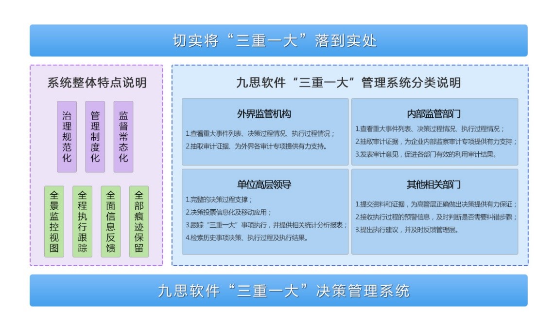 九思軟件“三重一大”決策管理系統,通過“三重一大”事項梳理和事項流程與環節的信息化固化,是國產自主可控系統產品,是央企、國企三重一大決策的有力支撐。