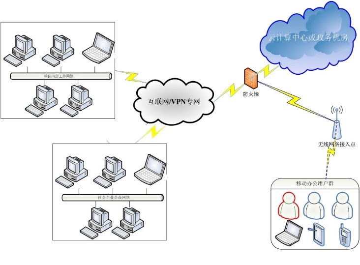 由于系統采用B/S結構設計,只需要在服務器端部署后,客戶端通過瀏覽器訪問即可使用,所以信息平臺只需要在服務器上部署即可,可以是專門的云計算中心,也可以是普通機房使用現有服務器資源或新增服務器都可以,各使用者通過VPN或互聯網接入使用。