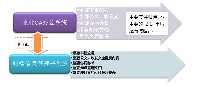 企業信息化發展起來后,幾乎所有辦公流程、郵件、收發文、公文、公告等重要業務,全部實現無紙化辦公存儲。其中重要的公文、流程、收發文等,按照企業管理規則,全部需要歸檔保存;還有OA系統中流轉傳遞的種種重要郵件、文檔、公告等,也有歸檔的需求。個人空間有限(100-200M),是無法滿足所有郵件、流程、公文的永久保存的。所以在此情況下,重要文件的歸檔管理需求,顯得更加突出。