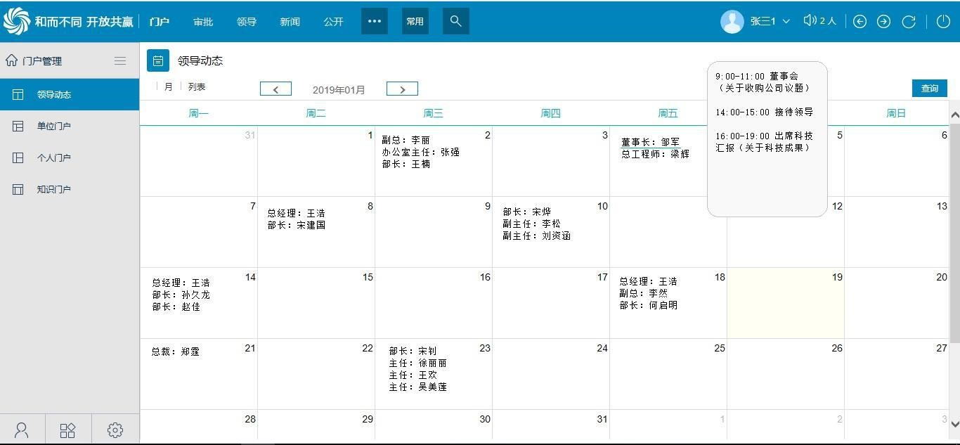 領(lǐng)導(dǎo)動態(tài)門戶,采用了扁平化的界面設(shè)計(jì)。整個(gè)界面通過日歷的形式展示,如下圖,用戶可以查看一周內(nèi)單位領(lǐng)導(dǎo)動態(tài)。鼠標(biāo)點(diǎn)擊或者靠近某一日期的領(lǐng)導(dǎo)名字時(shí),系統(tǒng)顯示提示框,提示各時(shí)間段內(nèi)的會議、計(jì)劃管理、日程安排等內(nèi)容,領(lǐng)導(dǎo)最新日程一目了然。用戶可以通過切換向左或者向右的按鈕,切換到不同的日期,顯示領(lǐng)導(dǎo)動態(tài)。