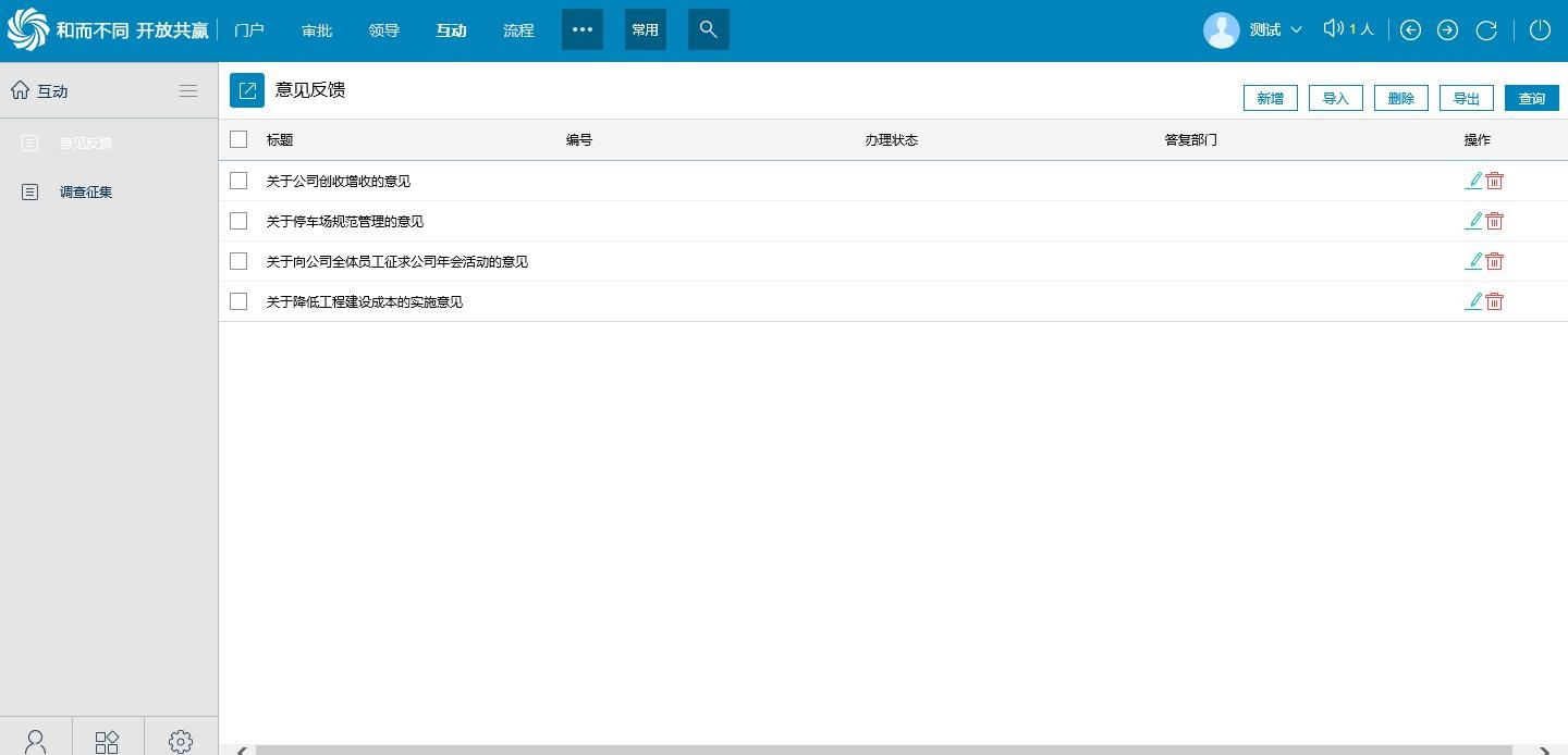 本模塊是為了實(shí)現(xiàn)高層決議對單位員工的意見反饋以及方案的調(diào)查征集,如下圖,互動模塊包括兩層菜單,分別是意見反饋和調(diào)查征集。
