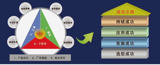 不謀全局者不足以謀一域。九思的咨詢和規劃團隊,由理論功底深厚的管理咨詢師、涉獵范圍寬廣的IT規劃師、經驗豐富的方案工程師、及成功客戶的應用實踐師組成,他們會頭腦風暴、群策群力,基于整體信息化、數字化、智能化的規劃思考,幫助客戶客戶繪制出個性化成功地圖,并將系統建設拆分成:選型成功、實施成功、應用成功、持續成功四個階段和12個關鍵成功要素,指導企業三化戰略通往持續成功之路。