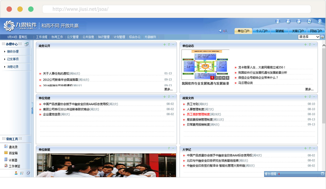 九思OA系統通過多維度信息空間技術,實現多層次、多維度、多視角、個性化的信息呈現,建立社情民意、互動交流、政策文件等各類信息的支信息共享平臺,提高事務處理效率,實現單位信息共享。