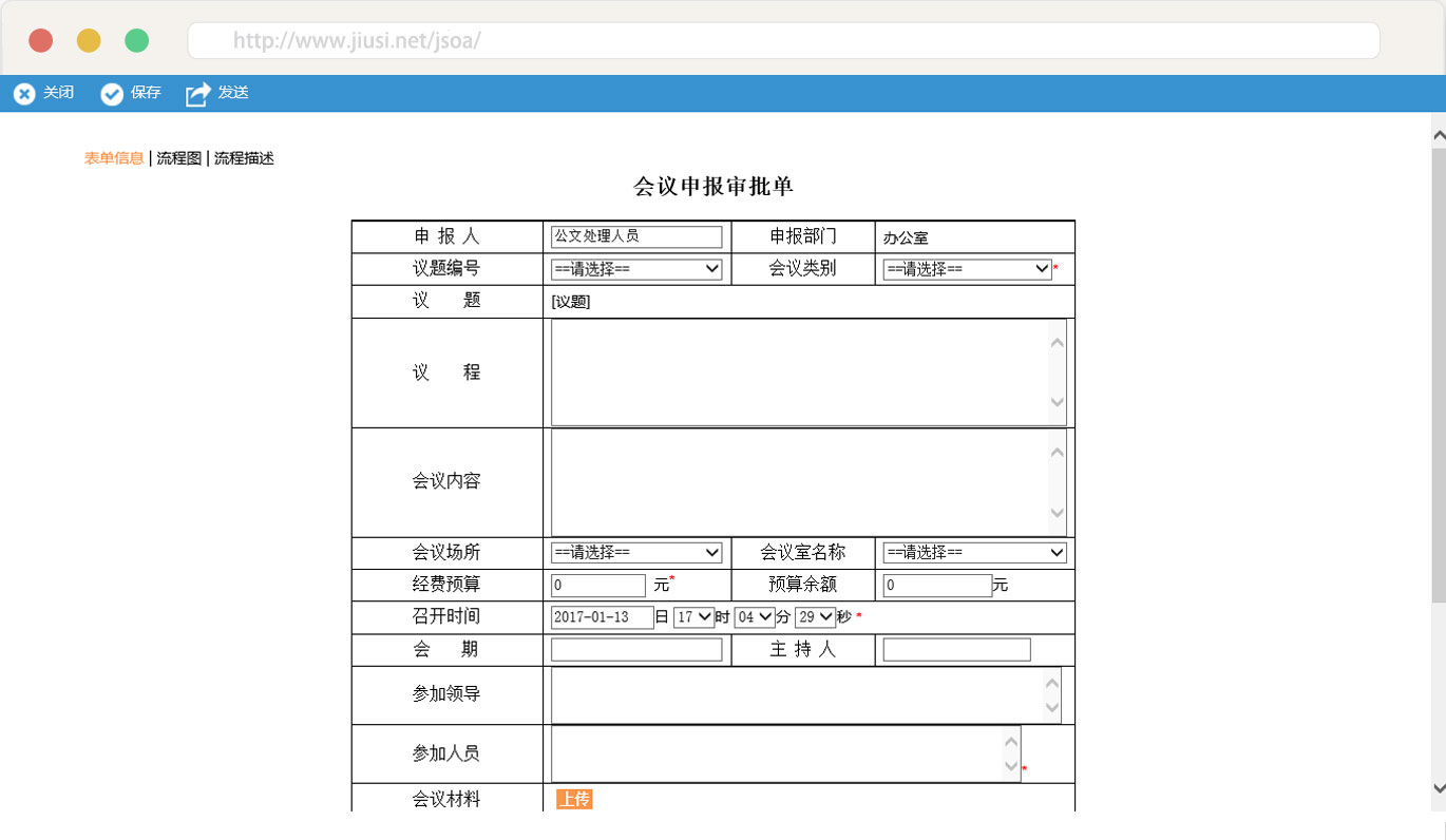 九思政務OA系統滿足政府完整的辦會程序需求,實現從議題收集、議題匯總、會議申報、會議室預定、會議通知及反饋、會議紀要等政府辦會全流程辦理,簡化會議管理工作流程,提高政府辦會效率,建立科學、規范、高效的會議管理信息系統。